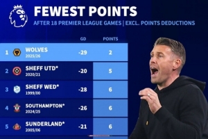 體育資訊12月29日訊 狼隊(duì)在本輪英超焦點(diǎn)戰(zhàn)1-2不敵利物浦,延續(xù)了本賽季的低迷表現(xiàn)。數(shù)據(jù)統(tǒng)計(jì)顯示,他們也創(chuàng)下了英超歷史前18輪同期最低積分。如果按照當(dāng)前的拿分情況,他們將最終僅積4分,而英超歷史單賽季最低總積分為11分。