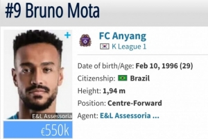 現(xiàn)年29歲的巴西前鋒莫塔,2025年初加盟K聯(lián)賽安養(yǎng),2025賽季共出戰(zhàn)37場(chǎng),貢獻(xiàn)14個(gè)進(jìn)球和3次助攻。