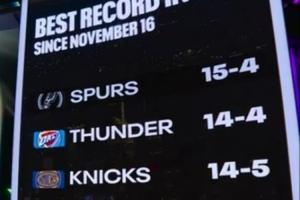 馬刺主場迎戰(zhàn)騎士,轉(zhuǎn)播方曬出近一個半月(11月16日至今)的戰(zhàn)績排名: