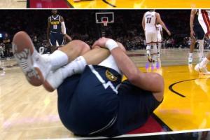 掘金當家球星約基奇在半場比賽結束前被隊友斯潘塞·瓊斯踩到腿部誤傷致膝蓋過度伸展提前退賽。