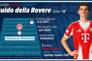 圭多·德拉羅韋雷,這位18歲的攻擊型中場(chǎng)身材高大卻技術(shù)細(xì)膩,被譽(yù)為“擁有細(xì)膩的左腳技術(shù)”。作為拜仁U23主力,他在地區(qū)聯(lián)賽中交出了4球9助攻的數(shù)據(jù),身價(jià)在一年半內(nèi)增長(zhǎng)了六倍。