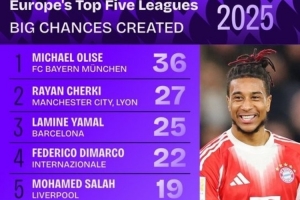 2025創(chuàng)造重大機(jī)會(huì)榜:奧利塞領(lǐng)跑,謝爾基、亞馬爾、迪馬爾科前四