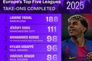 體育資訊12月31日訊 2025年即將結束,squawka也統(tǒng)計了本年度成功過人情況,亞馬爾斷崖領跑。