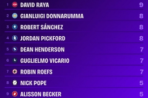 體育資訊1月2日訊 Squawka統(tǒng)計了本賽季的英超零封榜,阿森納門將拉亞第一。