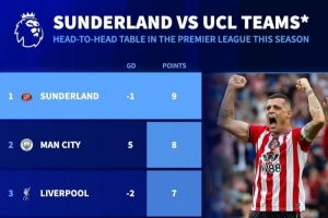 體育資訊1月2日訊 英超已經(jīng)進(jìn)行了19輪,《轉(zhuǎn)會市場》統(tǒng)計(jì)了本賽季至今英超聯(lián)賽對陣上賽季歐冠區(qū)球隊(duì)的拿分情況,升班馬桑德蘭9分最高。