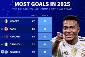 體育資訊1月2日訊 2025年已經(jīng)過(guò)去,《轉(zhuǎn)會(huì)市場(chǎng)》也統(tǒng)計(jì)了2025前15聯(lián)賽球員的俱樂(lè)部+國(guó)家隊(duì)各項(xiàng)賽事總進(jìn)球情況,皇馬前鋒姆巴佩領(lǐng)跑。