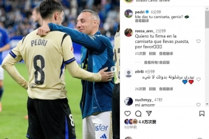 巴薩中場佩德里更新社媒動(dòng)態(tài),曬出與皇家奧維耶多40歲中場卡索拉的賽后合照,對(duì)其表達(dá)敬意,配文:“天才,能把你的球衣給我嗎?”