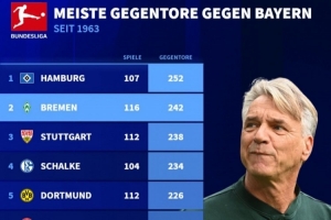 體育資訊9月26日訊 本周五晚拜仁即將在主場迎戰(zhàn)不萊梅,德國轉會市場網統(tǒng)計了德甲成立以來面對拜仁丟球數(shù)最多的10支球隊,其中漢堡排名第一,不萊梅就位居第二。
