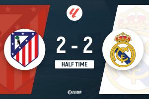 上半場(chǎng)補(bǔ)時(shí)7分鐘,馬競(jìng)2-2皇馬。