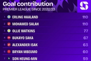 據(jù)Squawka的數(shù)據(jù)統(tǒng)計,自哈蘭德加盟曼城以來,他已經(jīng)在英超聯(lián)賽直接參與110粒進球,同期沒有哪名球員比他更多,只有薩拉赫同樣參與110粒進球與他持平。