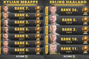 體育資訊10月03日訊 外媒Score90制作了一組對(duì)比圖,羅列了姆巴佩和哈蘭德的歷年金球獎(jiǎng)排名。