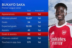 體育資訊10月4日訊 薩卡將迎來英超出戰(zhàn)200場里程碑,天空體育統(tǒng)計了薩卡首秀以來的英超數(shù)據(jù),他的出場次數(shù)、進(jìn)球、助攻等多項數(shù)據(jù)阿森納隊內(nèi)同期居首。