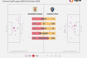 云南玉昆本場比賽有8次射正,追平球隊單場中超射正次數(shù)的紀錄——8月15日vs武漢三鎮(zhèn)也是8次。