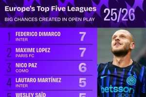 本賽季五大聯(lián)賽運(yùn)動(dòng)戰(zhàn)創(chuàng)造重大機(jī)會(huì)排名: