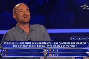 體育資訊10月11日訊 在德國(guó)版的《誰(shuí)想成為百萬(wàn)富翁》智力競(jìng)賽節(jié)目中,一位參賽者沒能回答對(duì)世界杯決賽的比分,錯(cuò)失12.5萬(wàn)歐元(約103萬(wàn)人民幣)獎(jiǎng)金。
