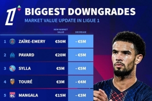 體育資訊10月12日訊 德國轉(zhuǎn)會市場更新了法甲球員的身價,并列出身價下跌排名,扎伊爾-埃梅里、帕瓦爾、西拉-500萬歐居首。
