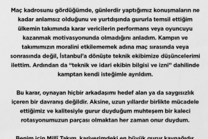 當(dāng)看到比賽名單時,我才意識到這些天來的溝通毫無意義——那些在海外為國爭光的球員,在國家隊決策者眼中,其表現(xiàn)和斗志根本不被重視。為避免影響集訓(xùn)營和球隊士氣,我選擇在返回伊斯坦布爾后向技術(shù)團(tuán)隊傳達(dá)了我的想法,而非在比賽期間或賽后,隨后在‘技術(shù)和管理團(tuán)隊知情并同意’的情況下,我自愿離開了集訓(xùn)營。