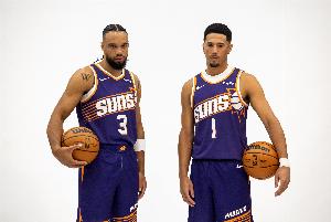 此役,狄龍打了22分鐘,9中4,三分4中1,罰球3中3,得到12分2籃板1助攻1搶斷,正負(fù)值+6;布克打了26分鐘,12中4,三分5中3,罰球8中7,得到18分5籃板5助攻1搶斷,正負(fù)值+14。