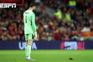 體育資訊10月14日訊 在今天凌晨進行的世界杯預選賽,比利時國門庫爾圖瓦試圖在球場上抓住一只老鼠。