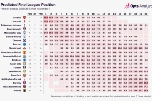 阿森納44.0%概率捧杯,25.8%亞軍,13.8%季軍。