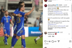 麥卡利斯特社媒曬出比賽照片,并寫道:“以兩粒進球結束了積極的國際比賽日之旅,與國家隊伙伴們共度數(shù)日時光總是令人感到愉快。”
