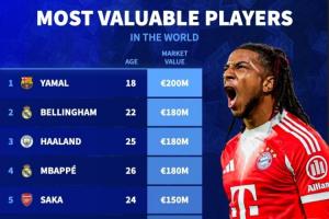 在西甲、意甲、法甲、德甲身價(jià)更新后,目前世界前20身價(jià)的球員如下。