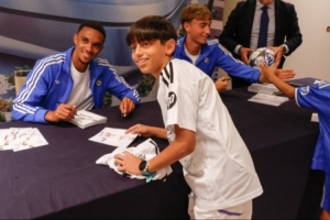 體育資訊9月13日訊 據(jù)西班牙六臺報道,皇馬后衛(wèi)阿諾德和赫伊森為皇馬小球迷們簽名,并合影留念。