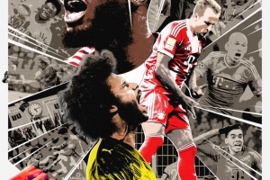 海報(bào)是充滿張力的拼貼畫風(fēng)格,拜仁后衛(wèi)于帕梅卡諾、凱恩一同出鏡,背景還有昔日對(duì)決瞬間。
