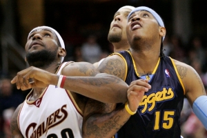 2003-04賽季,安東尼場(chǎng)均21分6.1籃板2.8助攻,掘金隊(duì)最終43勝39負(fù)排名西部第8進(jìn)入季后賽,詹姆斯場(chǎng)均20.9分5.5籃板5.9助攻,騎士隊(duì)最終35勝47負(fù)未能進(jìn)入季后賽。2003年最佳新秀評(píng)選,詹姆斯得分508分排名第一,安東尼得分403分排名第二。
