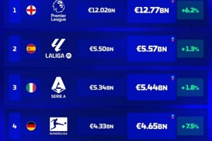 體育資訊10月20日訊 德轉此前更新了足壇球員身價,并盤點了五大聯(lián)賽球隊總身價榜,其中英超遙遙領先,以下為具體情況: