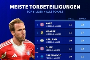 體育資訊10月20日訊 《轉(zhuǎn)會(huì)市場(chǎng)》統(tǒng)計(jì)了本賽季五大聯(lián)賽球員在俱樂部各項(xiàng)賽事的直接參與進(jìn)球總數(shù)情況,凱恩、姆巴佩、哈蘭德分列前三。