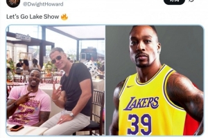 前湖人球員霍華德更新推特,他曬出了自己與佩林卡的合照,和自己身穿湖人39號(hào)的P圖,寫(xiě)道:“湖人,加油!”