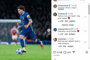 馬競前鋒阿爾瓦雷斯此役踢滿全場,賽后他在社交媒體上曬出比賽照片,配文:“抬起頭,繼續(xù)前進?!?/p>