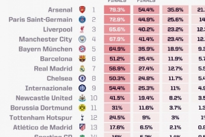 體育資訊10月23日訊 歐冠聯(lián)賽階段第三輪比賽戰(zhàn)罷,Opta超級(jí)計(jì)算機(jī)更新了各隊(duì)的奪冠概率,阿森納21.13%最高,巴黎、利物浦二三位。