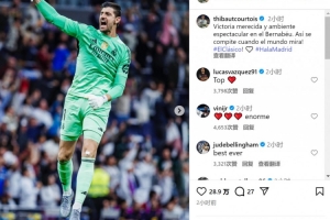 皇馬門將庫(kù)爾圖瓦社媒曬照慶祝勝利,配文:“實(shí)至名歸的勝利,伯納烏球場(chǎng)的氛圍震撼人心,在舉世矚目的比賽中就該有這樣的表現(xiàn)!”