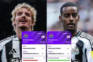 伊薩克上賽季:場(chǎng)均射門(mén)2.5次、射正1.5次,近0.8球;射門(mén)-進(jìn)球轉(zhuǎn)化率30.26%,傳球16.5次,成功率77.05%;快速做球1.6次,造犯規(guī)0.5次,成功爭(zhēng)頂0.9次,地面成功對(duì)抗2.2次,奪回球權(quán)1.8次。