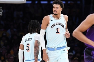 談到比賽中和文班的那次空接時,卡斯爾說道:“他跟我說往月球上扔。那個球真的是往月球扔,而他接住了?!?/p>