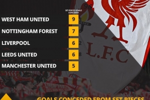 根據(jù)OPTA的數(shù)據(jù)統(tǒng)計(jì),本賽季英超中僅諾丁漢森林(9球)和西漢姆聯(lián)(7球)比利物浦(6球)在定位球方面丟球更多,而諾丁漢森林和西漢姆聯(lián)均身處降級(jí)區(qū)。另外,利茲聯(lián)在定位球丟球方面和利物浦同樣多,曼聯(lián)則丟了5球。