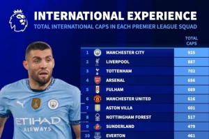 英超各隊(duì)球員為國(guó)家隊(duì)出戰(zhàn)場(chǎng)次排名: