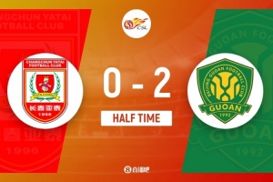傷停補時7分鐘。上半場比賽結(jié)束,長春亞泰0-2北京國安。