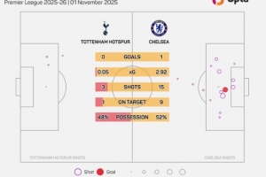 體育資訊11月2日訊 英超第10輪比賽,熱刺在主場以0-1的比分不敵切爾西。本場比賽,熱刺的預(yù)期進球數(shù)僅為0.05。