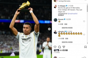 姆巴佩社媒曬出賽前展示歐洲金靴獎杯的照片,配文:“伯納烏的華彩之夜,全隊都表現(xiàn)出色,我們要繼續(xù)保持!Hala Madrid!”