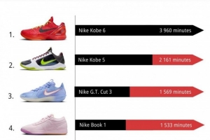 體育資訊11月3日訊 球鞋媒體Kixstats發(fā)布了NBA新賽季十月份的球鞋上腳時(shí)間排行。前十之中有三雙科比的球鞋,分別排在第一、第二和第五。