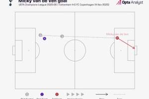 據(jù)Opta統(tǒng)計(jì),范德芬?guī)蚺軇?7.7米之后破門,這是2015年Opta統(tǒng)計(jì)相關(guān)數(shù)據(jù)以來,歐冠帶球距離最遠(yuǎn)的進(jìn)球。
