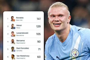 25歲哈蘭德52場(chǎng)歐冠轟入54球,目前排在歐冠歷史射手榜第10。距離第9的穆勒差3球。
