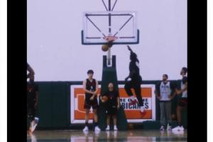 視頻中的楊瀚森與翻譯在籃下看隊友扣籃熱身。