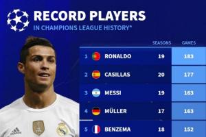 歐冠歷史出場(chǎng)榜:C羅183場(chǎng)居首,梅西第三,諾伊爾有望進(jìn)入前三