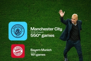 此役將是瓜迪奧拉執(zhí)教生涯帶隊參加的第1000場比賽,曼城官方社媒曬出瓜帥執(zhí)教場次的分布。