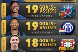 體育資訊11月10日訊 Score90統(tǒng)計了2025年五大聯(lián)賽后衛(wèi)在俱樂部+國家隊比賽中參與進球的數(shù)量,并列出榜單。