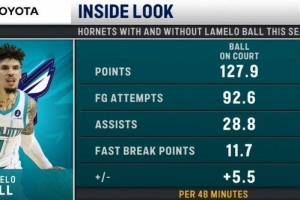 黃蜂自媒體曬出數(shù)據(jù),當(dāng)拉梅洛出站時,黃蜂每48分鐘凈負(fù)8.5分,當(dāng)他缺陣時,48分鐘凈勝5.5分。